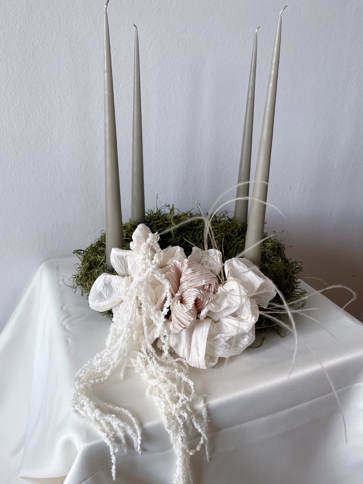 Til kransen medfølger 4 stagelys som vist på produktbilledet. Lysene er alle hånddyppede, elegante kvalitetslys af de reneste råvarer, fra vores samarbejdspartner Ester & Erik. Alle deres lys bliver fremstillet på deres fabrik i Silkeborg.